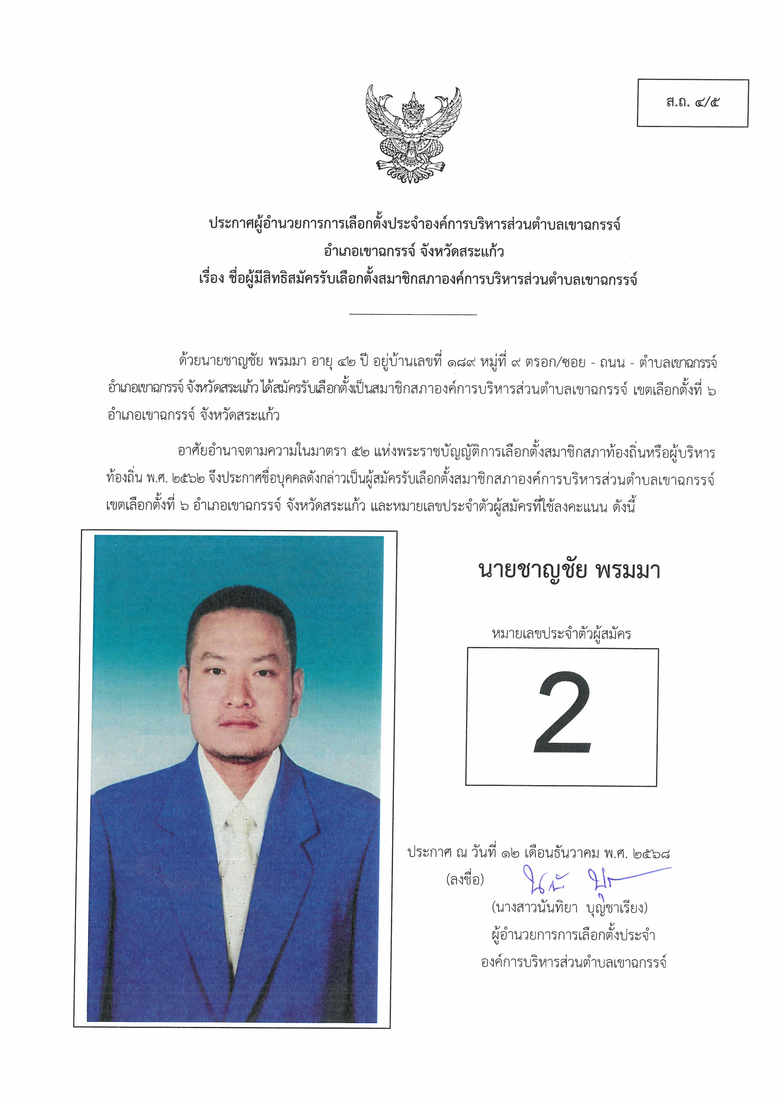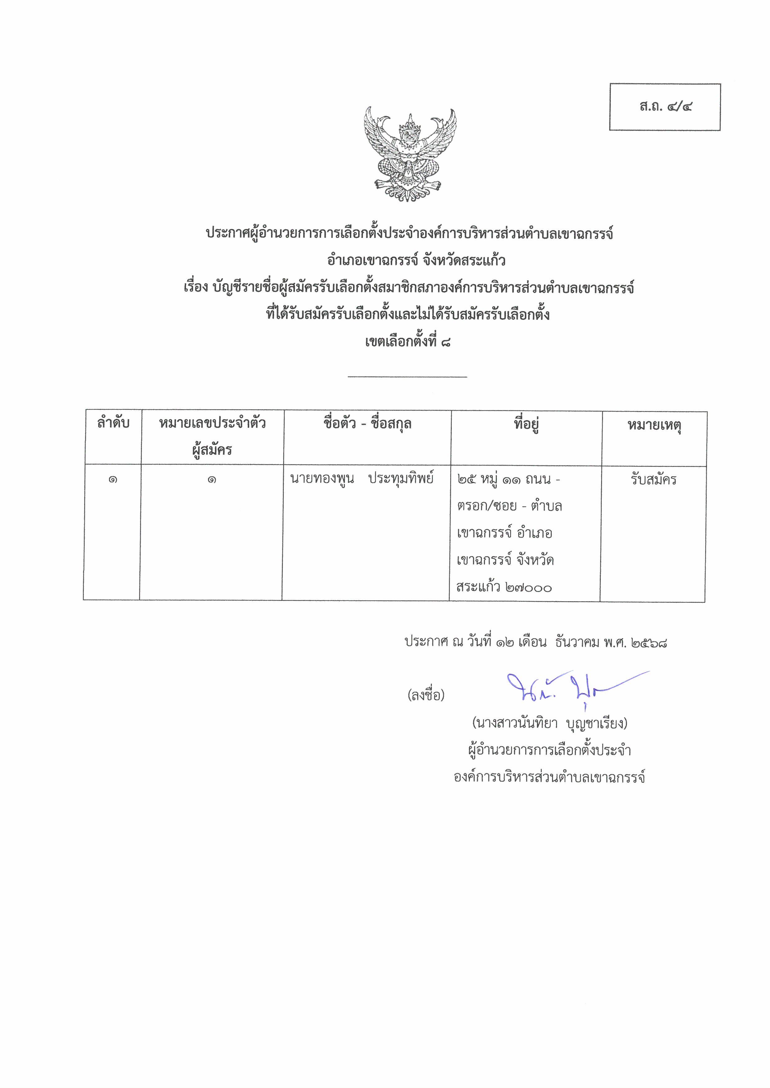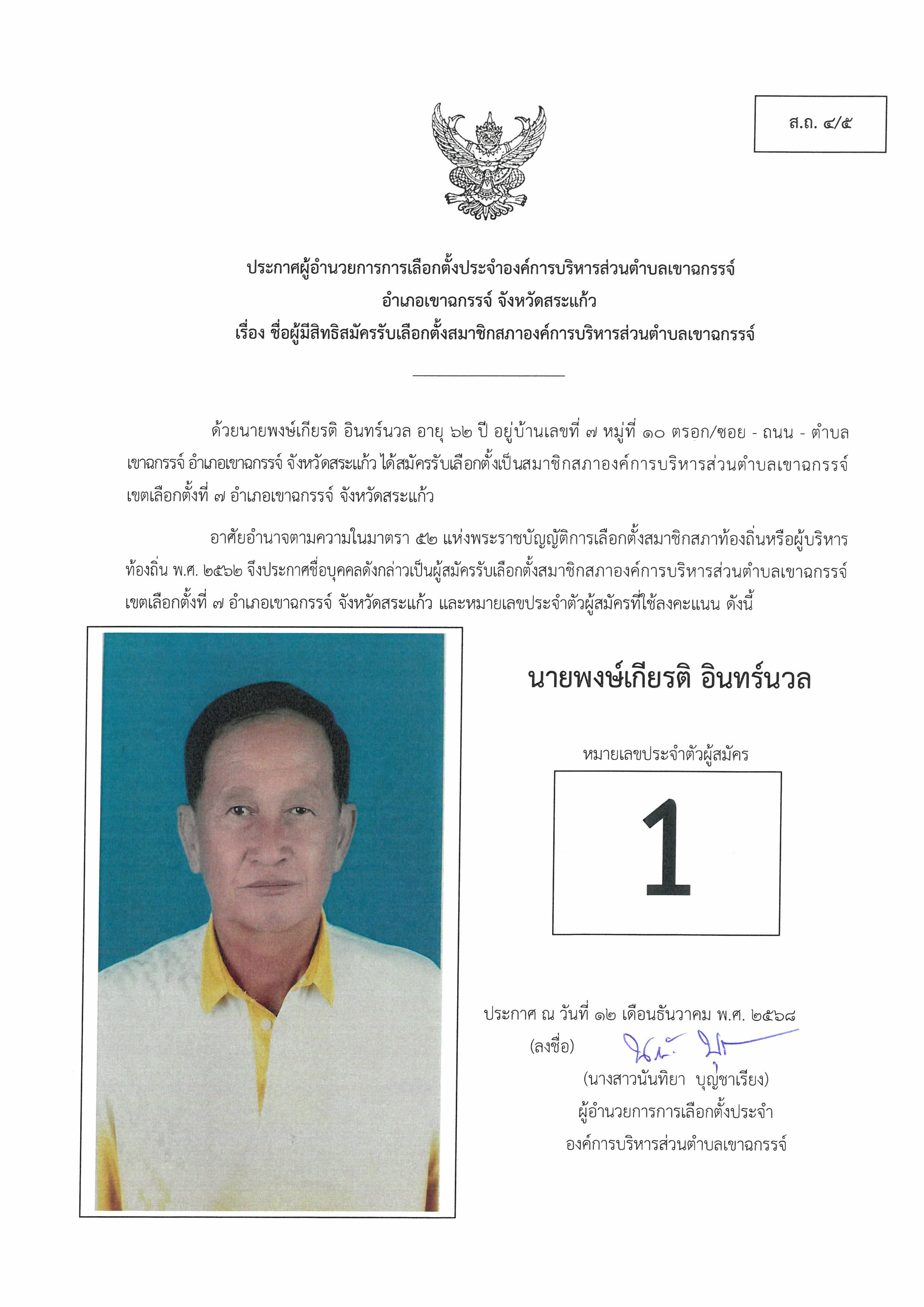 ประกาศบัญชีรายชื่อผู้มีสิทธิสมัครรับเลือกตั้ง นายกองค์การบริหารส่วนตำบลและสมาชิกสภาองค์การบริหารส่วนตำบลเขาฉกรรจ์ (ส.ถ. 4/4)(ส.ถ. 4/5)