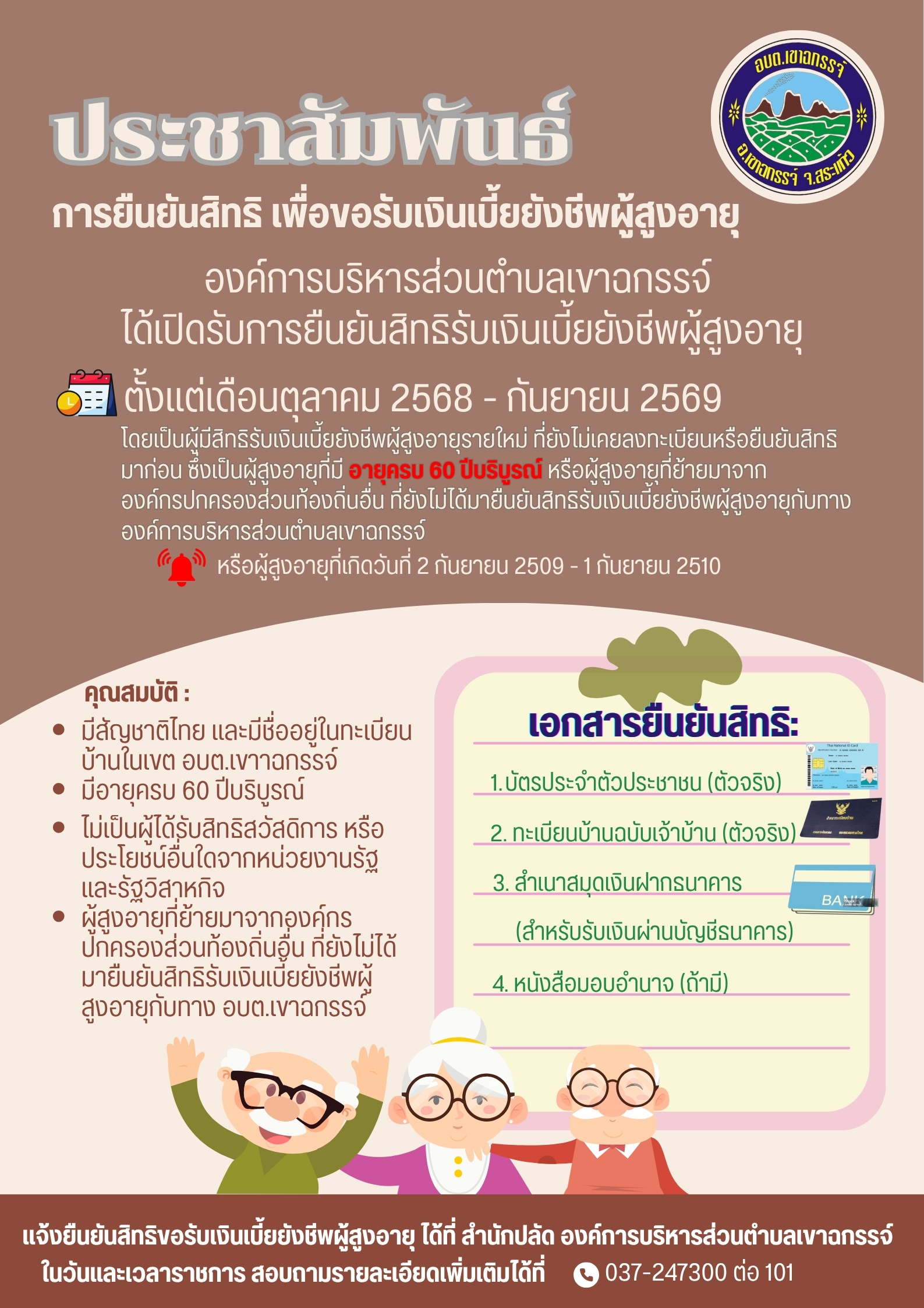 ประชาสัมพันธ์ การยืนยันสิทธิเพื่อขอรับเงินเบี้ยยังชีพผู้สูงอายุ ประจำปีงบประมาณ 2570