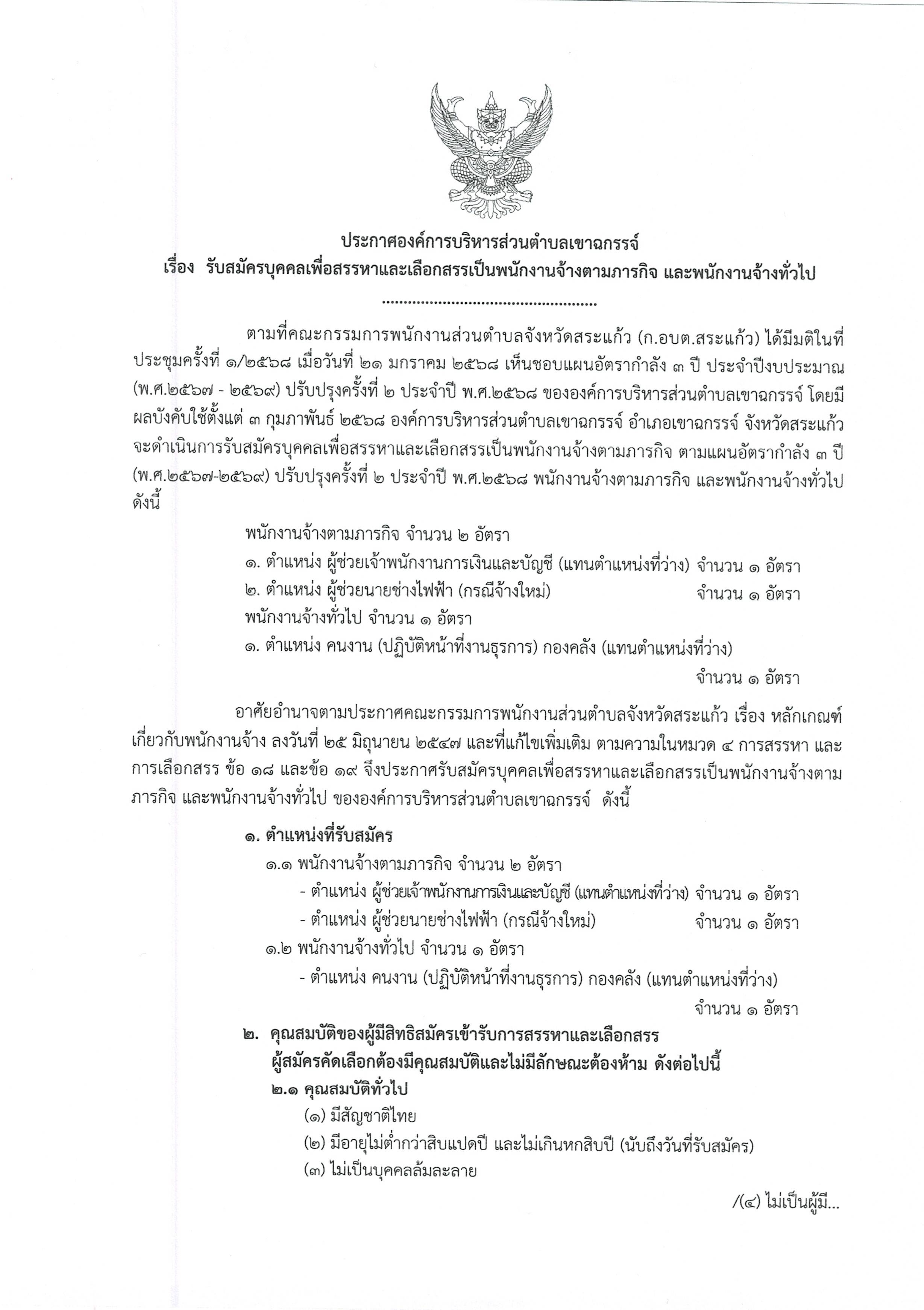 ประกาศองค์การบริหารส่วนตำบลเขาฉกรรจ์ เรื่อง รับสมัครบุคคลเพื่อสรรหาและเลือกสรรเป็นพนักงานจ้างตามภารกิจ และพนักงานจ้างทั่วไป